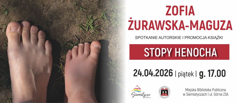 Serdecznie zapraszamy na spotkanie autorskie z Zofią Żurawską-Maguzą – autorką i wydawcą najnowszej książki pt. „Stopy Henocha”, które odbędzie się 24 kwietnia 2026 r. o godz. 17:00 w Miejskiej Bibliotece Publicznej w Siemiatyczach, ul. Górna 23A.